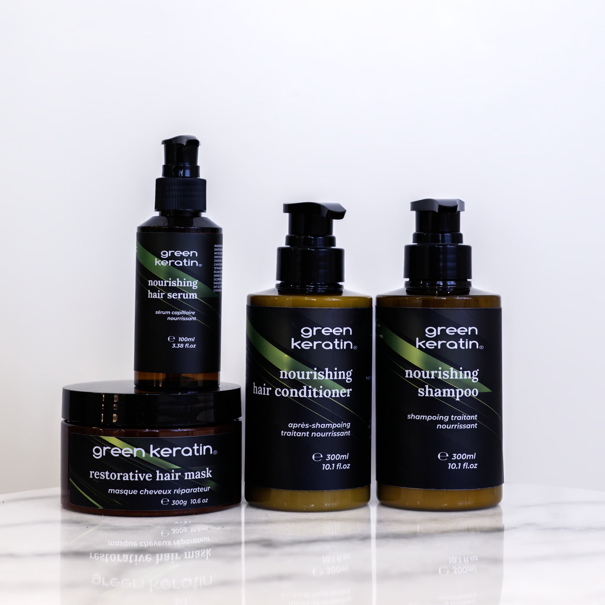 Redonnez vie à vos cheveux avec notre toute nouvelle collection capillaire Green Keratin. Ce coffret de 4 soins d’exception réunit l’ensemble du savoir-faire de Green Keratin dans une routine complète, conçue pour nettoyer, nourrir, réparer et sublimer tous les types de cheveux, même les plus abîmés.
