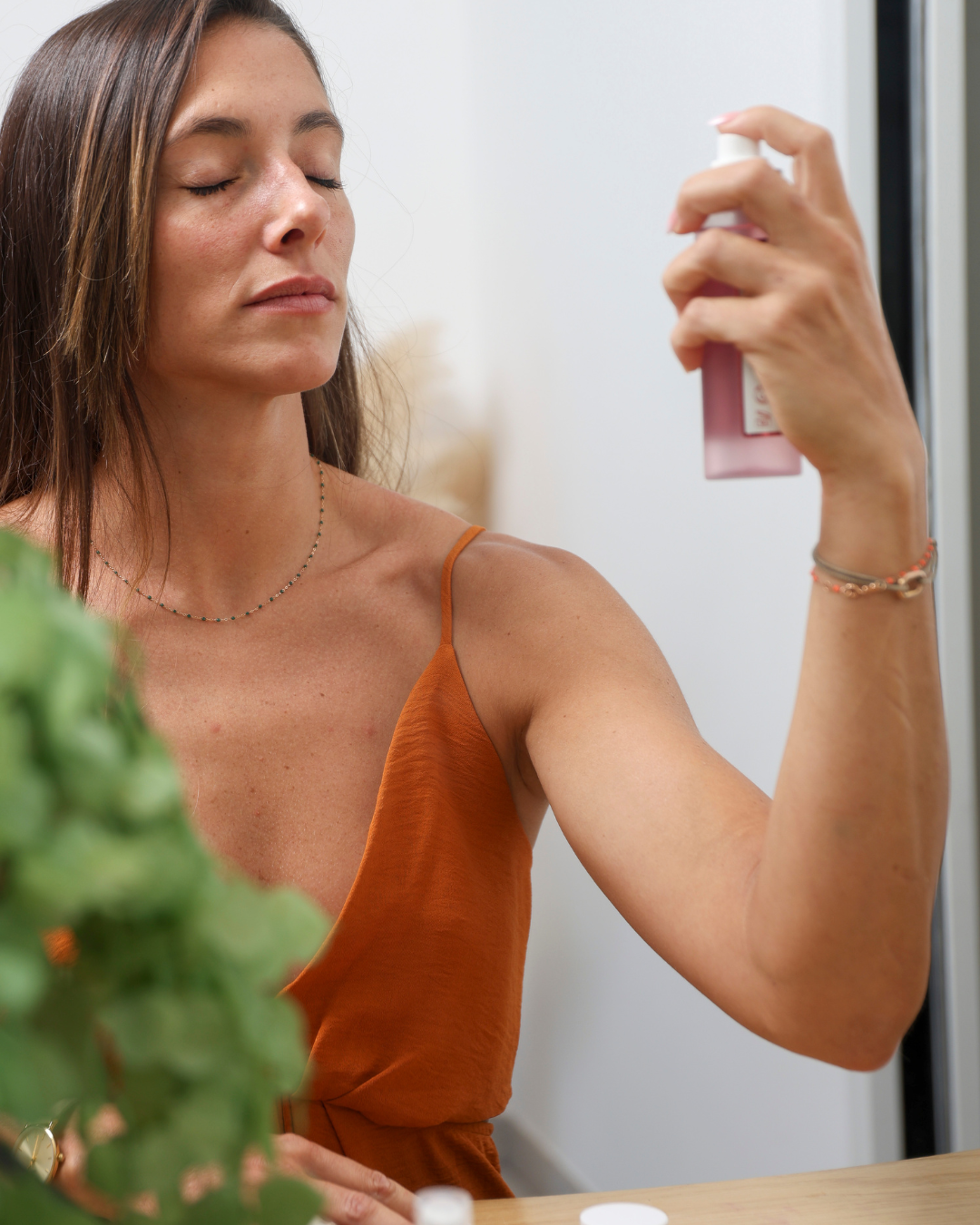 Bien agiter avant chaque utilisation. Tenir le flacon à 6–8 cm du visage. Les yeux fermés, vaporiser uniformément en formant les lettres X, T et H. Laisser poser 1 à 2 minutes sans toucher ni estomper.